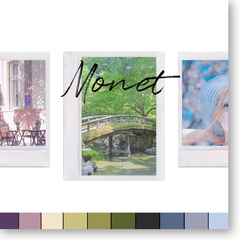 The real Monet shot.... With chalky blues and succulent greens, a hint of blushing pink and Monet's pastel palette is at your fingertips. Shadows are flat and brightness is up to give that impressionist, plein-air painting freshness!
